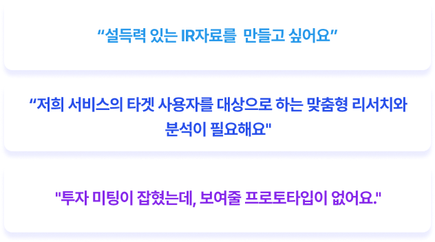 시장 리서치 부터 투자 유치용 프로토타입까지 한 번에 지원합니다.